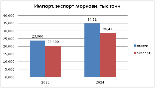 С морковью тоже всё не слава богу. Валовой сбор в 2024 году упал на 10 % по сравнению с 2023 годом. Но это только половина проблемы. Мы ещё и активно отправляли морковь за границу – 28,5 тысячи тонн ушло на экспорт, а вот завезли мы 34,8 тысячи тонн. То есть экспорт вырос в два раза, а импорт – в полтора.
