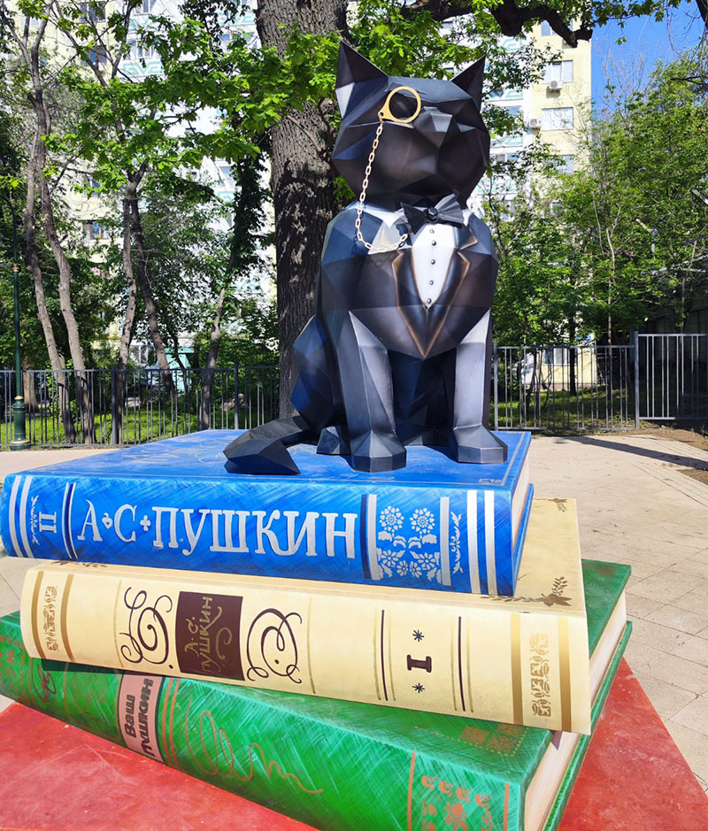 Пенсне и бабочка придают ему подозрительное сходство с котом Бегемотом из «Мастера и Маргариты». Впрочем, придираться особо не хочется. Кот получился харизматичный и явно добавил аллее настроения.