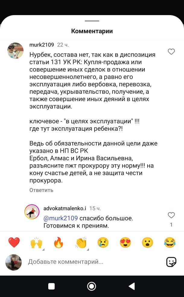 — В Комментариях к Уголовному кодексу РК также сказано: «объектом рассматриваемого преступления является личная свобода несовершеннолетнего». А «иные сделки предполагают обязательный признак – возмездность, то есть передачу несовершеннолетнего одним лицом другому с корыстной или иной антиобщественной целью», — отметил адвокат. – В нашем же случае никакой корысти не усматривается ни со стороны биологической матери, ни тем более со стороны приемных родителей, которые вкладывают все ресурсы – душевные, духовные, материальные, временные, в своего приемного ребенка.
