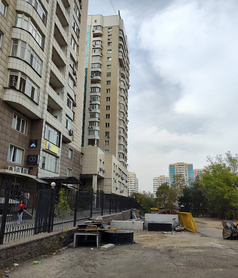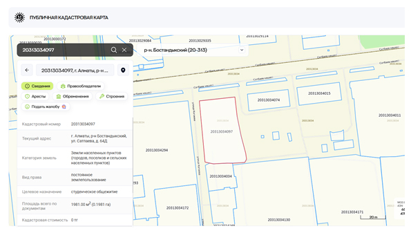 Еще один «герой» сериала — участок по адресу Сатпаева, 64Д (по Сатпаева между Радостовца и Катаева). Судя по информации из Публичной кадастровой карты, его целевое назначение — общежитие. Не спорим, что объект социально важный. В Алматы хронически не хватает мест для студентов.
