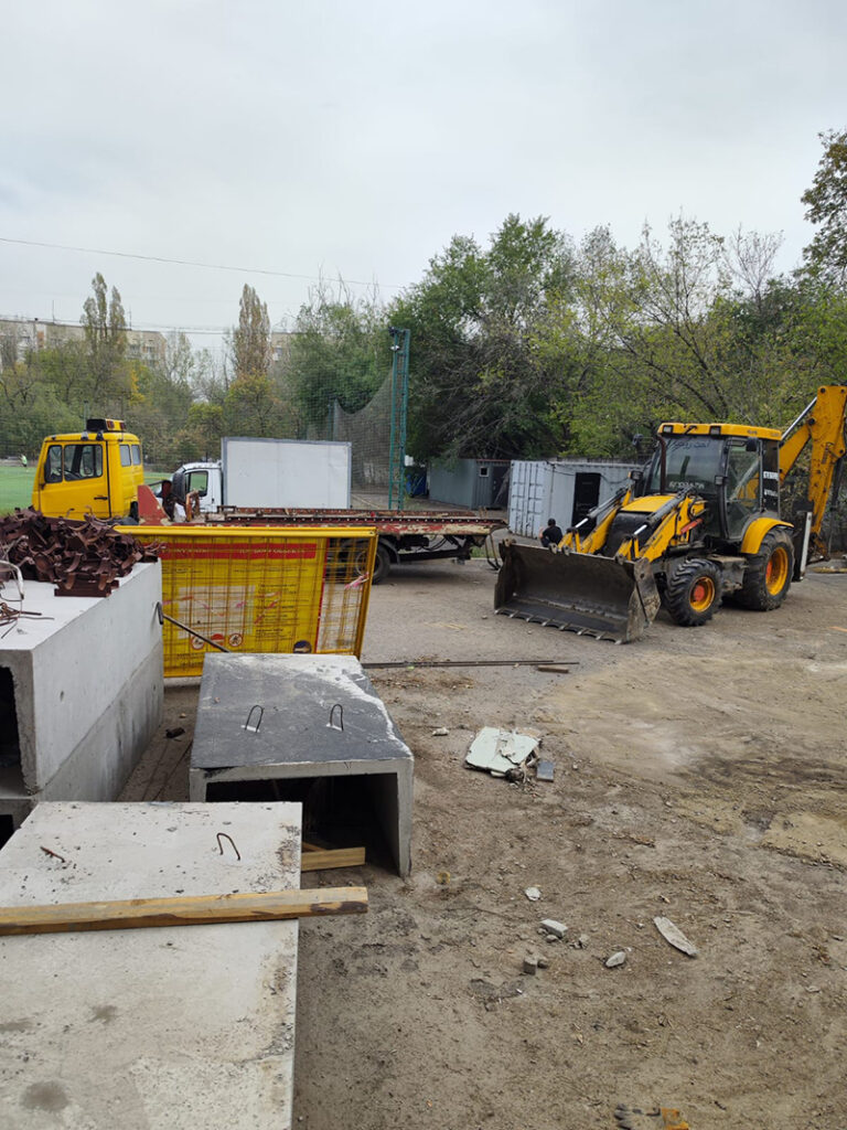 Сейчас рядом с футбольным полем (которое, судя по отзывам в 2ГИС, ещё и в аренду сдают) огороженная площадка, где гремит техника, сложены бетонные короба. Судя по всему, здесь прокладывают какие-то сети: то ли кабель, то ли трубу. Ирония в том, что по схеме участка именно на этом месте могли бы стоять спортивные тренажёры для учеников гимназии.