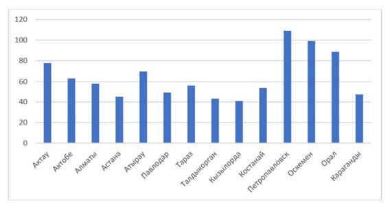 Отклонение фактического удельного энергопотребления для отопления жилых многоквартирных зданий от нормативного по регионам Казахстана, %