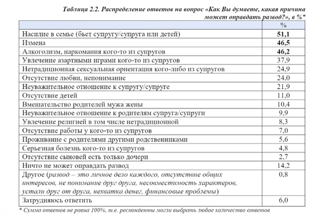 Половина участников опроса (51,1%) считает, что развод необходим, если один из партнеров применяет физическое насилие. Второй по значимости причиной названа измена (46,5%), следом идет алкоголизм (46,2%). Также в числе причин упоминаются наркомания и пристрастие к азартным играм. Четверть респондентов указали на нетрадиционную сексуальную ориентацию как основание для развода.