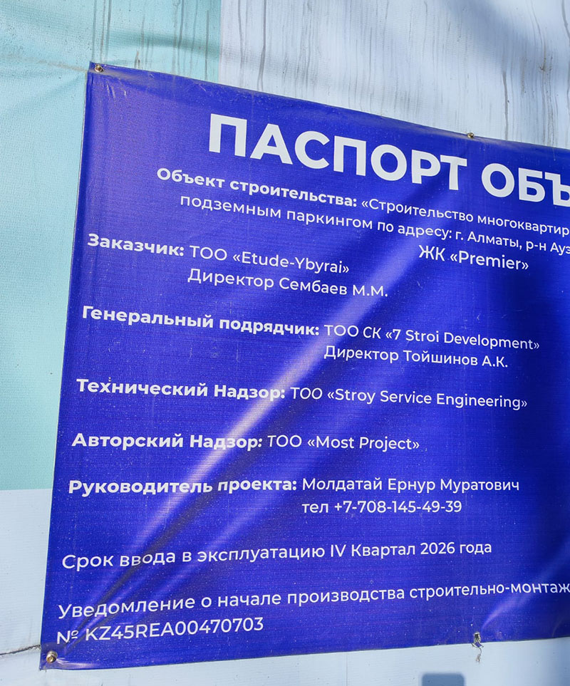 «Два месяца назад, в ноябре, мы с подругой ездили в офис продаж ЖК Premier, который находится на проспекте Абая, рядом с Дворцом спорта. Общались с менеджером. На тот момент, по словам менеджера, из пяти блоков по шесть этажей почти все квартиры уже были проданы. В продаже оставались всего три, которые выходят на торец соседнего здания со стороны спорткомплекса D-Fitness. По сути, это были единственные непроданные квартиры. Нам озвучили цену — 850 тысяч тенге за квадратный метр. При стопроцентной предоплате обещали скидку 4 %. При этом строительство фактически ещё не началось, даже первый этаж не был возведён. На вопрос, как вообще можно продавать квартиры на этом этапе, нам ответили, что договор заключается не напрямую с застройщиком, а с управляющей компанией, уполномоченной на продажу. Теперь о самом главном, о нарушениях. Улица, вдоль которой планируется заезд в ЖК, имеет ширину всего 4,8 метра. Такой же ширины и въезд на стройку. При этом здесь же предусмотрена парковка для людей с инвалидностью. Но по факту, если там стоит машина, грузовой транспорт просто не может развернуться и выехать. Именно поэтому инвалидам часто запрещали там парковаться, чтобы пропустить строительные машины. При этом у будущего ЖК нет выезда ни на Алтынсарина, ни на Шаляпина. Единственный выезд ведет на эту узкую пешеходную улочку, которая фактически находится прямо у перекрёстка. Возникает вопрос: как государственные органы вообще согласовали такой проект? Когда жители начали возмущаться, на встречу лично приходил заместитель акима Ауэзовского района Жарас Зейтаев. Он видел, что здесь рядом детский развивающий центр, поликлиника, проход к государственному реабилитационному центру в ЖК Park House, по этой дороге дети самостоятельно ходят в школу. Тротуара здесь нет, забор вынесли прямо к дороге, видимость плохая, особенно зимой и в тёмное время суток. Это потенциально опасное место. На встрече, которая фиксировалась на видео, Жарас Уалиханұлы прямо заявил, что запрещает проезд грузового транспорта по этой улице, назвал её пешеходной и пообещал установить соответствующие знаки. Знаки действительно появились со стороны Алтынсарина и Шаляпина. Однако застройщик неоднократно нарушал этот запрет и продолжал запускать сюда грузовики. Отдельный вопрос по реализации квартир. Для нас их продажа выглядит как серьёзное нарушение и нонсенс», — рассказала жительница соседнего ЖК Park House Светлана.
