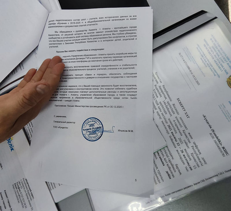Ильясов утверждает, что у компании имеются фактические подтверждения: инструкции, скриншоты и документация, показывающие, что данные выгружали из системы Kundelik и загружали в альтернативную платформу. Эти материалы, по его словам, направлены в Комитет национальной безопасности при Министерстве просвещения и в Комитет по информационной безопасности Министерства цифровизации.