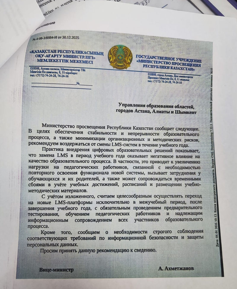 В Управлении образования Алматы с такой трактовкой не согласны. В ведомстве пояснили, что решение о переходе принималось с учётом потребностей школ, педагогов, учащихся и их законных представителей, а также при обязательном соблюдении требований законодательства и информационной безопасности.