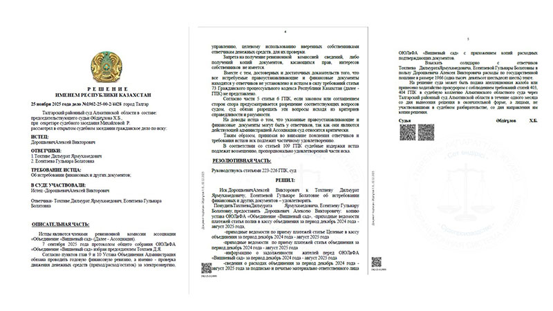 — Работа ведётся. Есть вступившие в силу решения Талгарского районного суда и СМЭС, их поддержала апелляция. Сейчас идут исполнительные производства, мы пытаемся получить документы у председателя, но исполнение решений блокируется администрацией.