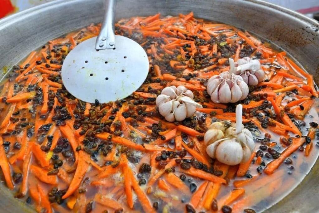 «Нут заранее замачивают в холодной воде минимум на 12 часов, а еще лучше на сутки, несколько раз меняя воду, — рассказывает Зайтуна. — После этого его промывают и отваривают до полуготовности. В казане или посуде с толстым дном разогревают масло. Обжаривают лук до золотистого цвета, затем добавляют морковь, нарезанную крупной соломкой. Обжаривают все вместе 8–10 минут на среднем огне, пока морковь не станет мягкой, но не разваренной. Добавляют специи, всыпают нут, перемешивают и заливают кипятком так, чтобы он слегка покрывал овощи. Оставляют зирвак кипеть 15 минут. Рис тщательно промывают и засыпают ровным слоем поверх зирвака, не перемешивая. Аккуратно доливают кипяток — примерно на 2–3 см выше уровня риса. В центр кладут несколько зубчиков чеснока. Готовят на сильном огне до выпаривания воды, затем накрывают крышкой, уменьшают огонь до минимума и томят 20 минут. Точно так же, как с нутом, можно приготовить плов с любыми бобовыми».
