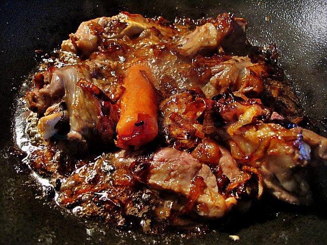 В раскаленный казан наливают масло и хорошо его прокаливают. Добавляют лук, обжаривают до золотистого цвета. Затем закладывают мясо крупными кусками, жарят на сильном огне до румяной корочки. Добавляют морковь, нарезанную толстой соломкой, слегка обжаривают.