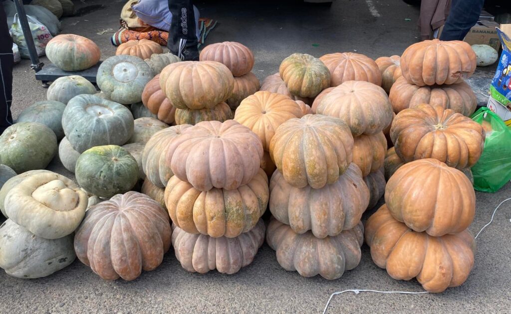 В раскаленном казане прокаливают масло, обжаривают лук, затем морковь. Тыкву нарезают кубиками и кладут в казан, слегка обжаривают. Добавляют зиру и паприку.