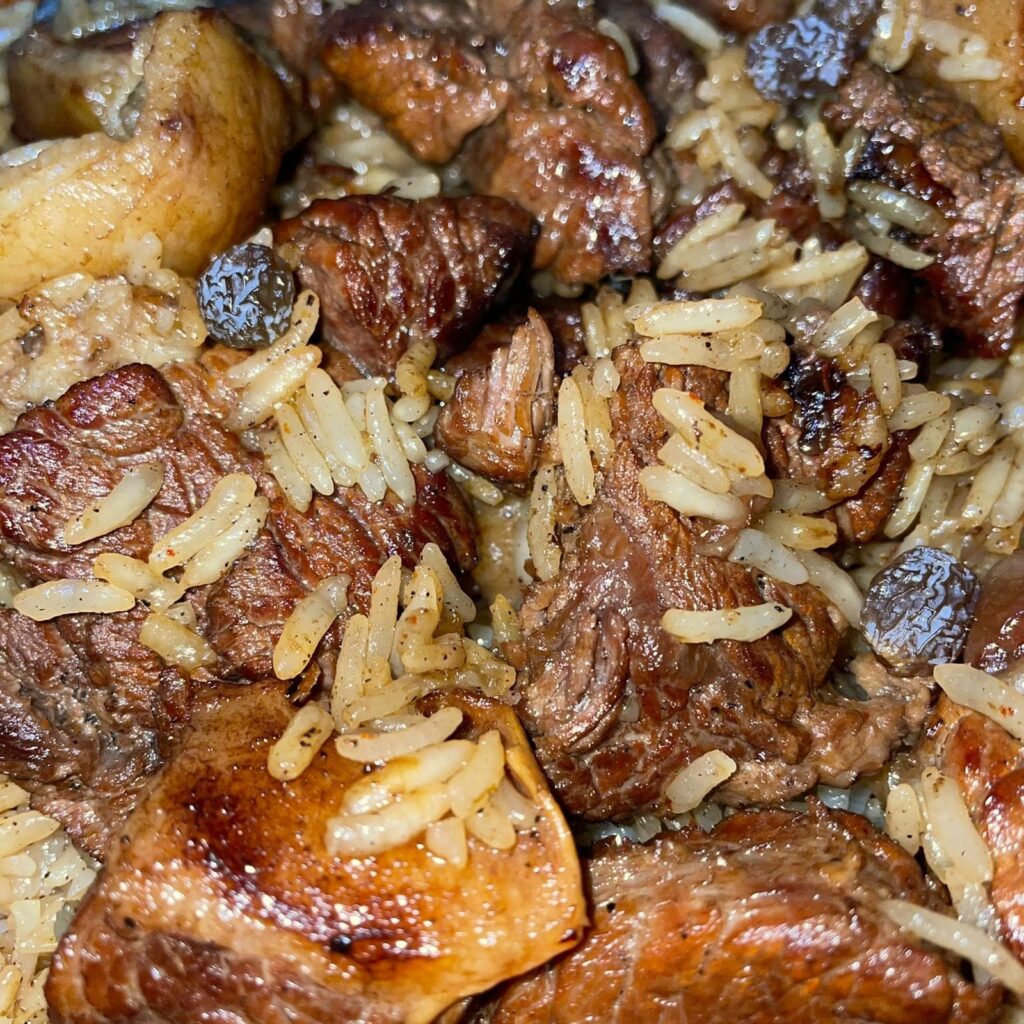 «В посуде с толстым дном раскаляют масло, обжаривают желудочки, сердечки, другие субпродукты — рассказывает Мария о собственно процессе. — Добавляют лук, морковь, тоже доводят до золотистого цвета. Засыпают промытый рис, заливают горячей водой из расчета на два стакана крупы четыре воды, солят, перчат. Томят на слабом огне до полной готовности крупы. Рис впитывает мясной сок, становится нежным. Блюдо выходит бюджетным, но насыщенным и по-настоящему домашним».