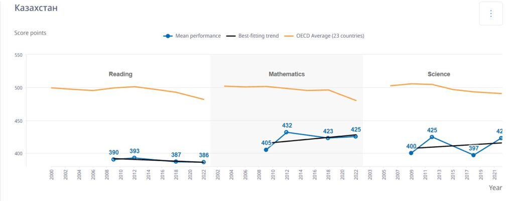 И, как учитель, могу привести массу примеров, когда на учителей давят, заставляют показать высокие результаты внутренних итоговых тестов, например, во время МОДО. Особенно этим грешат классы с казахским языком обучения и казахские школы. Учителя там более послушные, для них авторитет руководителя неоспорим, и, если сказали, что нужен высокий результат – они «сделают» этот результат. Знаете, в школе, как в том крылатом выражении юмориста: «Султан сказал «Рахат!» – народ сказал «Лукум!». А с увеличением зарплаты педагогов эта зависимость от руководства стала еще ощутимее. Обратите внимание: в диаграмме отчёта PISA не отмечен результат Казахстана за 2015 год, нас вообще из рейтинга исключили, официальная причина – грубые ошибки маркировщиков. А по сути, это была попытка и результаты PISA фальсифицировать: было много ответов с завышенной оценкой. Конечно, это сразу вскрылось… Плохие результаты исследований PISA 2018 и 2022 годов министерство объясняло тогда тем, что ещё не все ученики перешли на обучение по типовым учебным программам обновлённого содержания образования (ОСО), отсутствием опыта сдавать такой тест в электронном формате, COVID-19 и массой других причин.