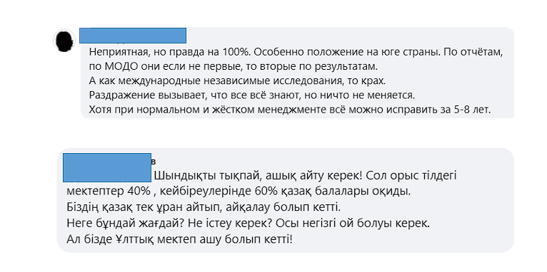 Я периодически делаю публикации и перепосты интересных статей у себя на странице в Facebook. Последняя публикация на эту тему, кстати, тоже на статью Жандоса Асылбекова, в Facebook вызвала неоднозначный отклик. Один комментатор даже обвинил меня в шовинизме. Но были и вот такие конструктивные комментарии: