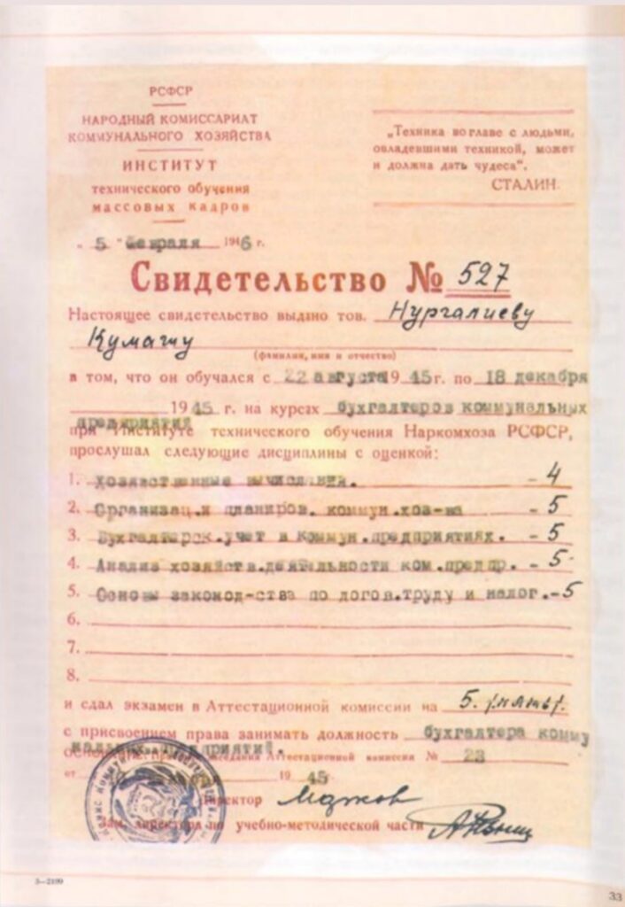 Несмотря на перенесенные тяжелейшие операции, он нашел в себе силы учиться. Ему помогали педагоги — Наталья Балдина и Зинаида Толстикова. Они давали ему не только полноценные знания, но и нечто большее: веру в себя, в свои силы, в возможность победить в борьбе с тяжелыми испытаниями, выпавшими на его долю. Так, в стенах военного госпиталя, где смерть буквально ходила по коридорам, Кумаш Нургалиев получил школьный аттестат. И свидетельство бухгалтера коммунальных предприятий.