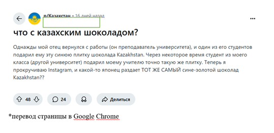 «Однажды мой отец, преподаватель, вернулся с работы, и один из студентов подарил ему эту синюю плитку Kazakhstan. Через какое-то время студент из моего университета подарил такую же плитку моему учителю. А теперь я листаю Instagram, и вижу, как японец раздаёт тот же самый шоколад! Что вообще происходит с этим шоколадом?»