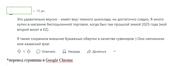 «Очень вкусно. Тёмный шоколад, но не горчит. Я набрал его в дьюти-фри, когда был в Казахстане зимой 2025 года (это мой второй визит в страну). Даже обёртку сохранил, которая напоминает флаг Казахстана».