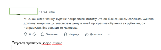 «Мне, как американцу, курт не понравился, потому что он был слишком соленым. Однако другому американцу, участвовавшему в моей программе обучения за рубежом, он понравился. Все зависит от человека», — пишет один из туристов.