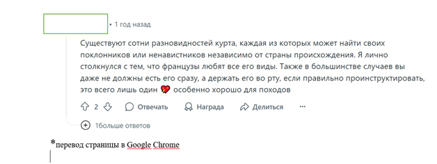 «Существует множество разновидностей курта, и каждая из них может найти как своих поклонников, так и противников — вне зависимости от страны происхождения. Лично я заметил, что французы, с которыми сталкивался, любят все его виды. Впрочем, важно понимать: курт не обязательно сразу жевать, чаще всего его просто держат во рту, чтобы он постепенно размягчился. При правильной инструкции по применению это вполне съедобно. Особенно удобно в походах».