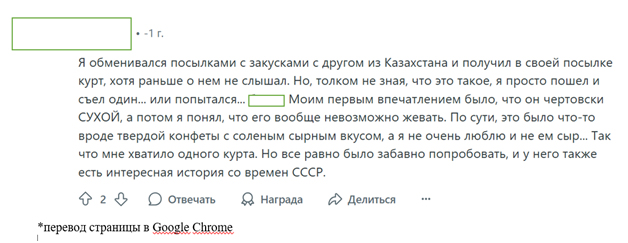 «Я всегда задавался вопросом, почему я ненавидел есть сыр, когда был в Казахстане, оказалось, что мне совсем не нравится вкус желтого сыра советского образца. Он каким-то образом умудряется быть хуже, чем Kraft singles (тонкие квадратные ломтики сырного продукта, упакованные поштучно в пластиковую обёртку. — Авт.)», – пишет иностранец.