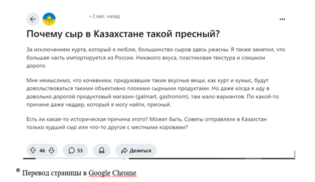 «Мы просто не делаем сыр сами. Российские молочные продукты — это просто косплей молочных продуктов. Они повсюду в магазинах Казахстана, потому что они очень дешевые», — объяснили иностранцу.
