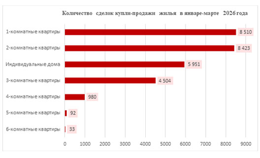 Теперь, о том, какое жильё покупают. Судя по данным Бюро статистики, основной спрос приходится на однокомнатные и двухкомнатные квартиры. На них пришлось соответственно 8,5 тысячи и 8,4 тысячи сделок. Трёхкомнатные уже сильно отстают. Всё, что больше по площади — вообще не котируется. По четырёхкомнатным меньше тысячи сделок на всю страну, по пятикомнатным — десятки.