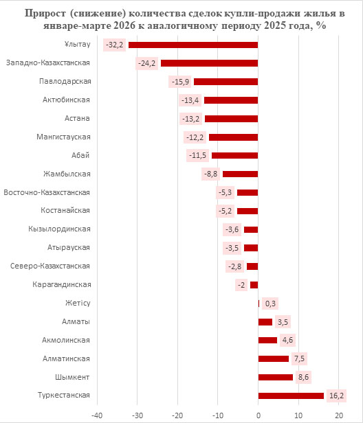 В Астане вообще вышло минус 13,2 % к январю-марту 2025 года. И это при том, что население столицы за год (с марта 2025 по март 2026-го) выросло на 7,2 %. Людей стало больше, квартир тоже, а сделок — меньше. Парадокс? Скорее, новая реальность.