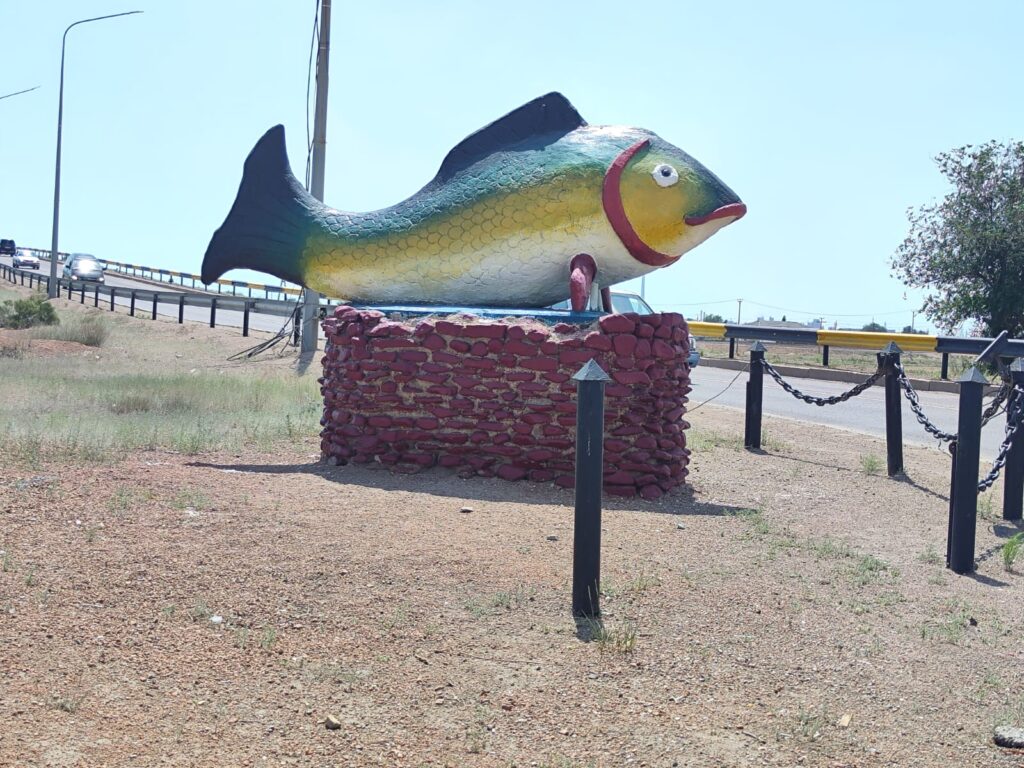 Перед въездом в город наше внимание привлекли настоящие символы города – монументы сазанов по обе стороны моста. Не удержалась и сфотографировалась с одним из них. В общем, кто-то делает фото с Эйфелевой башней, а кто-то – с рыбой. Кстати, здесь же можно заправиться и полюбоваться на степные и пустынные пейзажи.