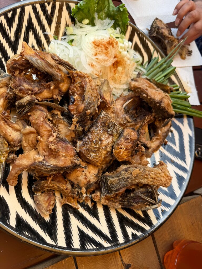 В магазинах рыбу мы покупать не стали (боялись не довезти), но работники базы отдыха приготовили нам жареного сазана. Цена — 4600 тенге за килограмм, но оно того стоило. Нежное мясо, без запаха, буквально таяло во рту. Теперь понимаю, почему балхашского сазана так любят.