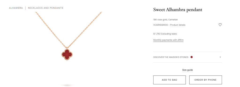 На сайте компании Van Cleef and Apels такое же, из золота с сердоликом, стоит 1 740 евро, то есть примерно 913 тысяч тенге.