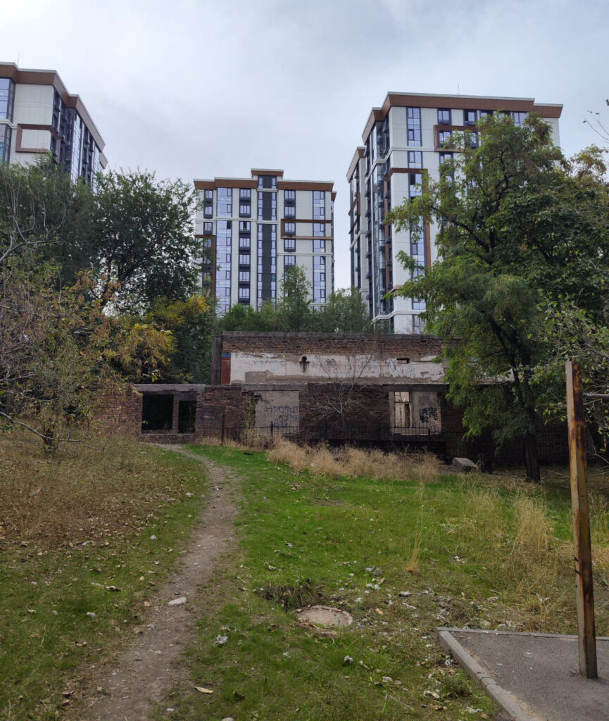 Не забываем и про второй участок по адресу Сатпаева, 64Д (по Сатпаева между Радостовца и Катаева). Это бывший Немецкий театр. Когда-то здесь гастролировали актёры, шли спектакли, строились планы на реконструкцию. Государство даже выделило финансы. Но деньги украли. Театр закрылся. Теперь здание выглядит так, как будто в нём снимают фильмы ужасов.