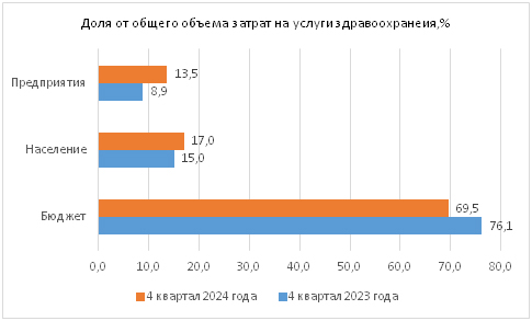 Бюджетная поддержка медицины сокращается. Если в четвертом квартале 2023 года на госфинансирование приходилось 76,1 % всех затрат в здравоохранение, то в том же периоде 2024-го – уже только 69,5 %.