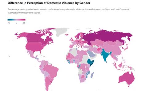 На глобальной карте, составленной по результатам опроса, видна яркая разница между восприятием мужчин и женщин. В некоторых странах их оценки почти совпадают, в других расходятся драматически.