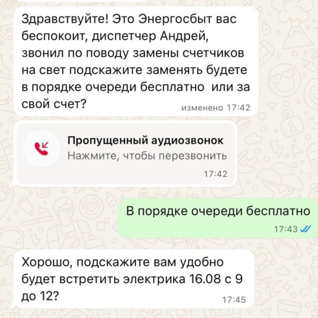Собеседники предлагают заменить счетчики в порядке очереди бесплатно. Далее следует вопрос: «Во сколько вам удобно, чтобы пришёл электрик для замены счётчика?». Человек соглашается, называет удобное время, и тут начинается главное.