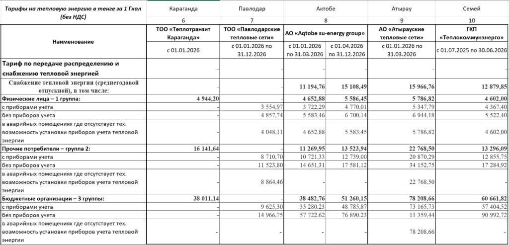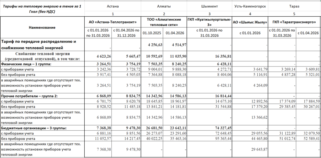 В Алматы тариф для населения — 29,34 тенге, для предприятий — 43,36 тенге с НДС, для бюджетных организаций — 43,52 тенге с НДС.