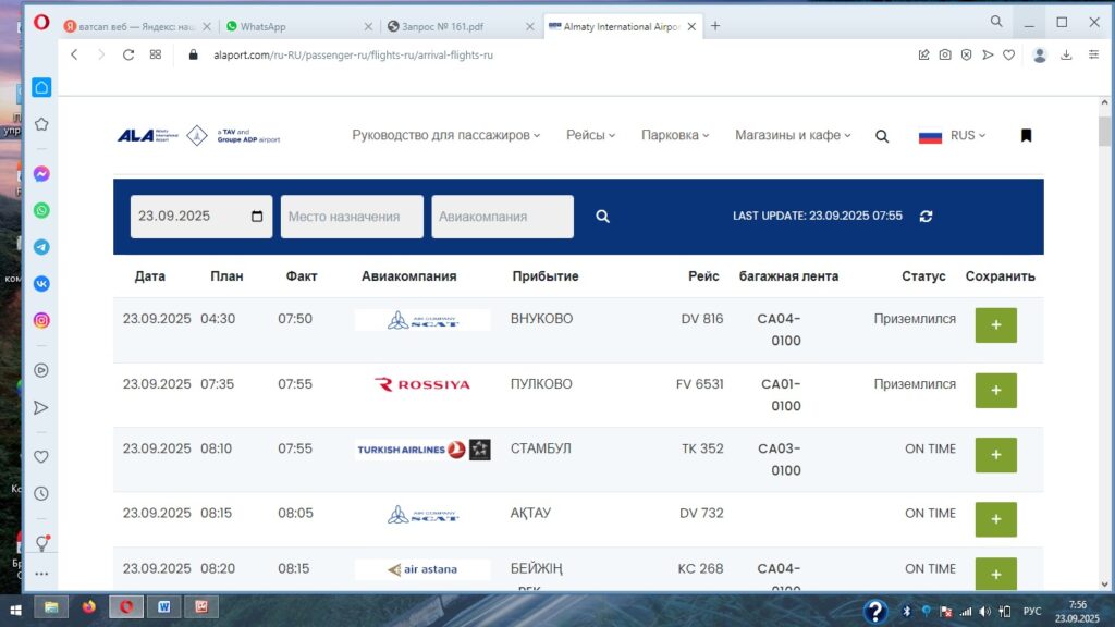 Покажем на свежем примере расписания за 23 сентября. В расписании на онлайн-табло аэропорта Алматы alaport.com написано: