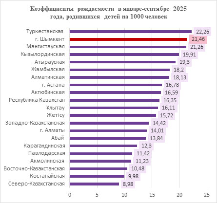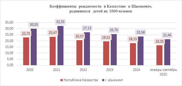 По данным Бюро статистики, в среднем по Казахстану в 2024 году рождаемость составляла около 18 новорождённых на 1000 человек, а в Шымкенте — 23,58.