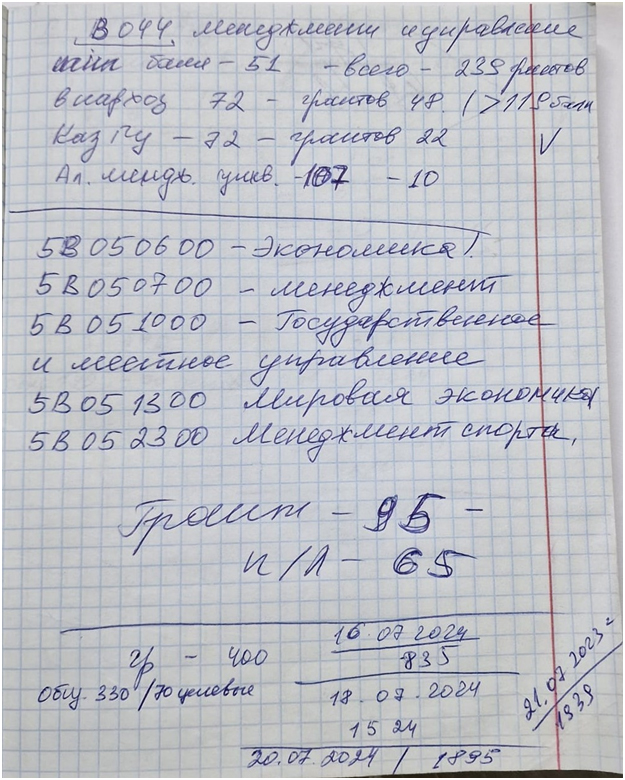 Нас интересовал Менеджмент и управление. Я с первых дней записал минимальный 51 балл, всего 239 грантов. Но надо понимать, что в тот же Нархоз, как в Univision написали, проходной был 72 балла. Я туда позвонил, мне ответили, что у них такого низкого порога не может быть. Проходной бал для них — 119.