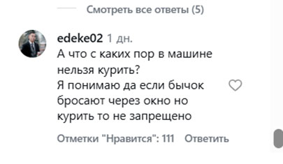 Теперь разберём ещё один эпизод — курение из окна автомобиля. В комментариях под видео развернулась отдельная дискуссия.