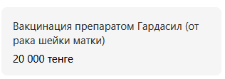 Желающим, которые не входят в категорию «девочки 11-13 лет», предлагается получить вакцину от ВПЧ в частных клиниках. Понадобится минимум 2 дозы вакцины, взрослым чаще рекомендуют ставить 3. В Алматы и Астане одна доза стоит 110-120 тысяч тенге, в других городах — 110. То есть минимум 220 тысяч тенге. Сумма для многих неподъемная, особенно если в семье несколько дочерей. К тому же получить вакцину можно только по рецепту, что означает прием в частной клинике у платного специалиста, который может выписать этот документ. Не говоря о том, что кто-то еще должен ее поставить, соблюдая все требования к процедуре.