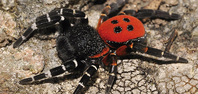 «Довольно крупный паук. Характеризуется половым диморфизмом: самка имеет одноцветную бархатисто-черную окраску, самец — ярко-красное брюшко с четырьмя черными пятнами. Передние две пары ног самцов — черные с белыми кольцами, задние — оранжевые. Головогрудь очень крупная, квадратная. Укус для человека может быть очень болезненным».
