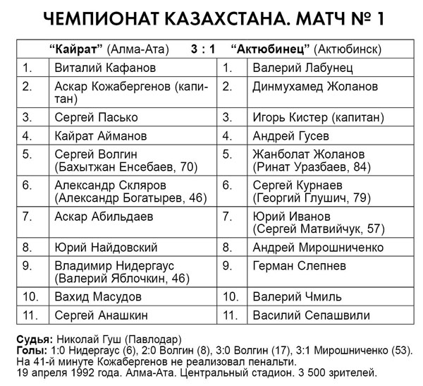 Матч, открывший новую страницу в футбольной истории республики, прошел на Центральном стадионе Алма-Аты 19 апреля 1992 года. В нем встретились “Кайрат” и победитель 8-й зоны 2-й лиги чемпионата СССР-1991 “Актюбинец” из Актюбинска.