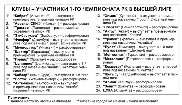 Но и этот формат оказался неокончательным. Еще до первого свистка чемпионат недосчитался “Кайрата-2” (Алма-Ата), “Джетысая” (Джетысай, Чимкентская обл.) и “Локомотива” (Джамбул), не решивших свои финансовые проблемы. По той же причине после 2 туров с турнирной дистанции сошел “Металлург” из Джезказгана. Так что в первом в истории чемпионате Казахстана выступили 24 клуба.