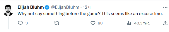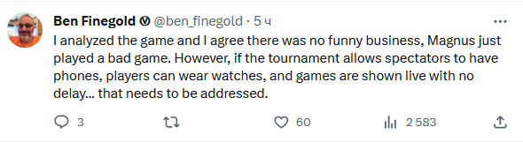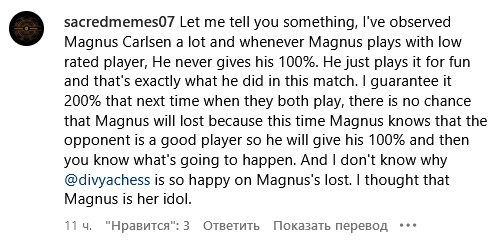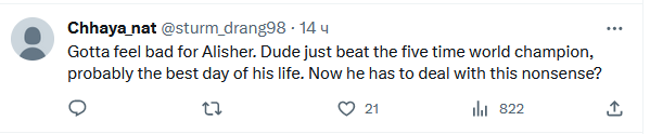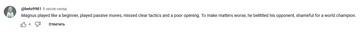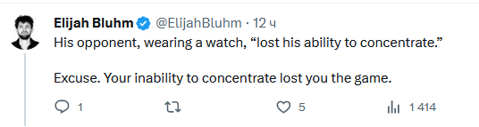 Сам Карлсен заявил, что потерял концентрацию из-за того, что на руке его соперника были часы, передает медиапортал Сaravan.kz. Карлсен написал в социальных сетях, что возмущен равнодушием организаторов турнира к "жульничеству", в том числе обратив внимание на зрителей, которые ходили со смартфонами в руках очень близко от игроков. Позже он добавил, что не обвиняет Алишера в нечестной игре, однако комментаторы уже высмеяли норвежца и призвали достойно признать заслуженное поражение.