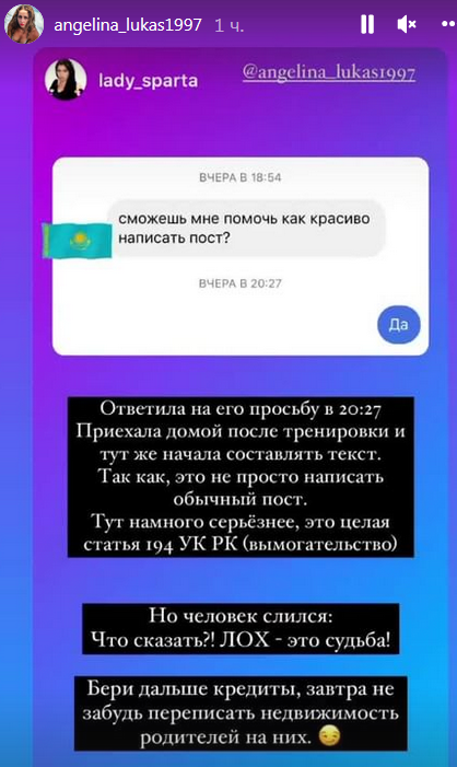 В сториз отмечена другая казахстанская боксерша Ангелина Лукас, которая опубликовала эти сториз на своей странице.