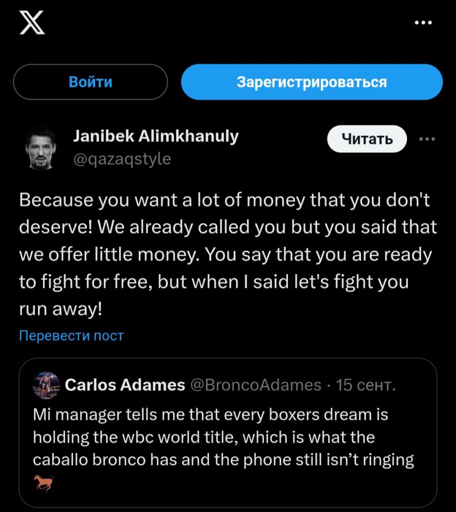На этот раз Жанибек ответил Карлосу на его пост в социальной сети Х (бывший Twitter). Адамес написал, что никто из боксеров, желающих отобрать у него титул, не выходит на связь.