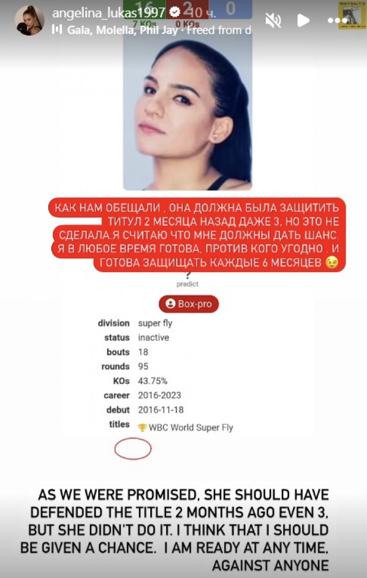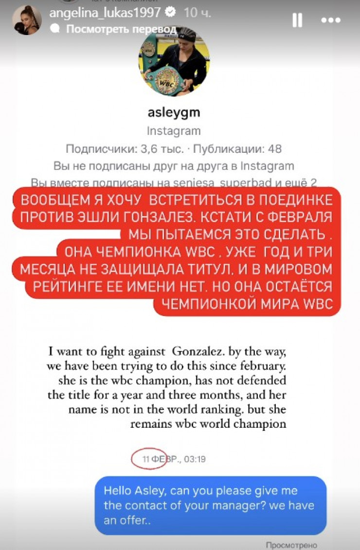 "Я хочу встретиться в поединке против Эшли Гонсалес. Кстати, с февраля мы пытаемся это сделать. Она чемпионка WBC. Уже год и три месяца не защищала титул. И в мировом рейтинге ее имени нет. Но она остается чемпионкой мира WBC. Как нам обещали, она должна была защитить титул два месяца назад, даже три. Но это не сделала. Я считаю, что мне должны дать шанс. Я в любое время готова, против кого угодно. И готова защищать каждые шесть месяцев", — написала Лукас в сториз Instagram.