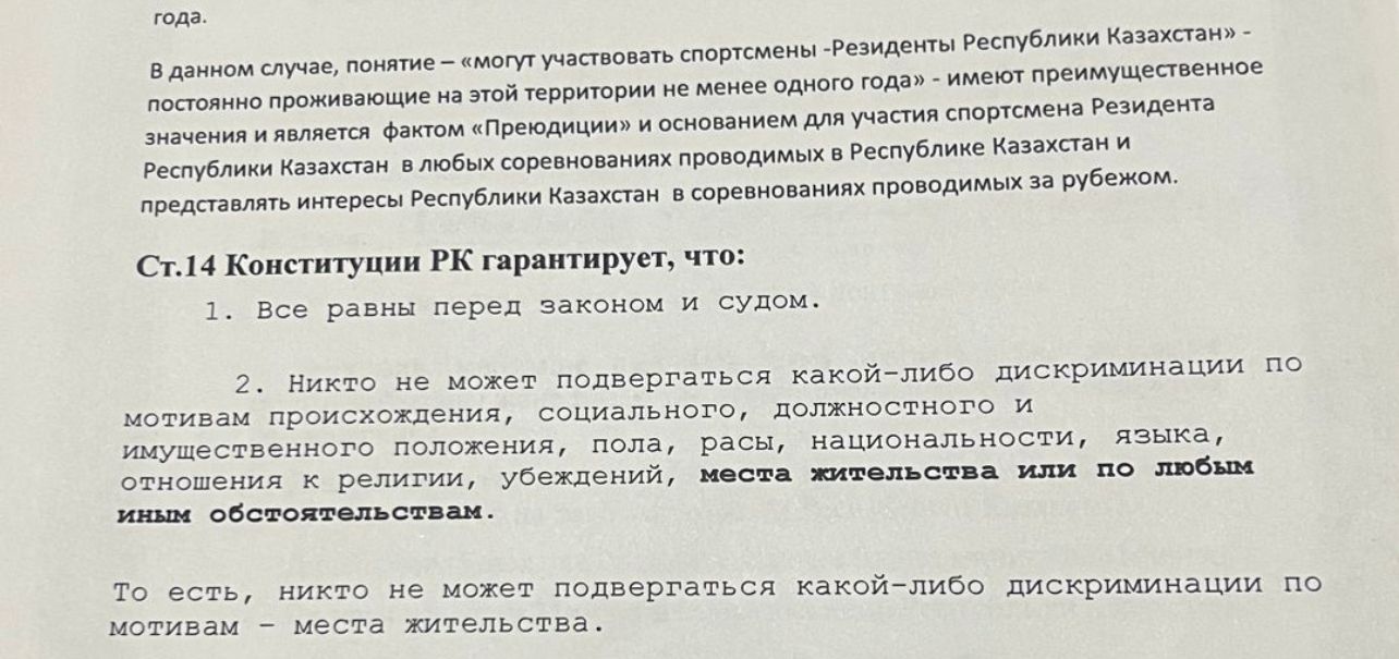 За день до боя звонили моему тренеру организаторы и сказали, что у меня не хватает каких-то документов к участию, и сказали, что будет собрание. Тренер отправил все необходимые документы на WhatsApp организаторам, и тренер, конечно же, задался вопросом, какое может быть собрание, если у Лукас уже завтра бой, а жеребьевка и мандатная комиссия прошли 15 мая. После жеребьевки и мандатной комиссии проходит два дня, когда уже весь процесс прошел, когда у Лукас назначена дата боя, но все равно организаторы проводили собрание и пытались снова препятствовать. В интервью Азиз Кожамбетов говорит, что я вообще в этой Спартакиаде не должна была участвовать, он ссылается на регламент, что я выступала за Тараз, где была не прописана ровно год, хотя по регламенту Министерства культуры и спорта я имела полное право выступать на Спартакиаде, так как я являюсь резидентом Республики Казахстан и, соответственно, проживаю более года на территории Республики Казахстан.