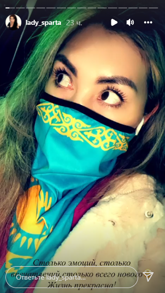 "Столько эмоций, столько впечатлений, столько всего нового. Жизни прекрасна!" — подписала боксёрша сториз. На фотографии лицо и грудь спортсменки прикрывает ткань голубого цвета с рисунком, как на флаге Казахстана.