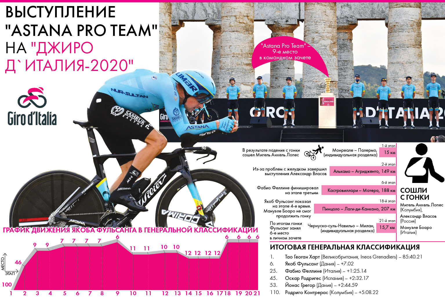 Между тем в Италии “Astana Pro Team” завершала “Джиро” в сильно усеченном составе. Вслед за Мигелем Анхелом Лопесом, пострадавшим при падении еще на первом этапе, и Власовым сошел итальянец Мануэле Боаро. Таким образом, на решающие отрезки многодневки у капитана казахстанской команды Якоба Фульсанга остались только 4 помощника. Тем не менее датчанин удержал итоговое 6-е место в генеральной классификации.
