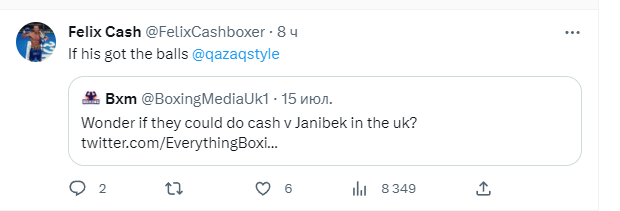В последнее время идут разговоры о возможном бое между Жанибеком Алимханулы и Феликсом Кэшем. Промоутер Эдди Хирн сообщил, что заинтересован в том, чтобы этот поединок состоялся. И недавно Феликс Кэш ответил на твит, в котором один из пользователей задавался вопросом: "Интересно, смогут ли они организовать бой Кэша против Жанибека в Великобритании?". Кэш отметил аккаунт Жанибека Алимханулы и ответил: "Если у него есть яйца".